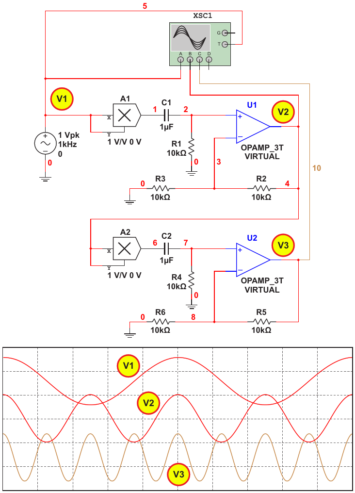 Два аналоговых удвоителя частоты, A1 + U1 и A2 + U2, соединенные каскадом, образуют умножитель частоты на четыре