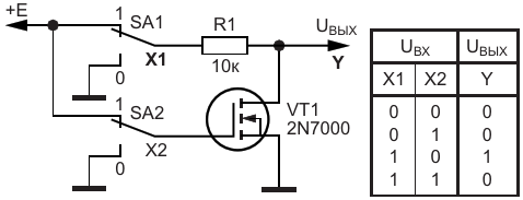 Рисунок 1. Электрическая схема эквивалента логического элемента «Запрет» и его таблица истинности