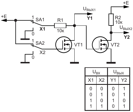 Рисунок 1. Электрическая схема эквивалента логического элемента «Запрет» и его таблица истинности