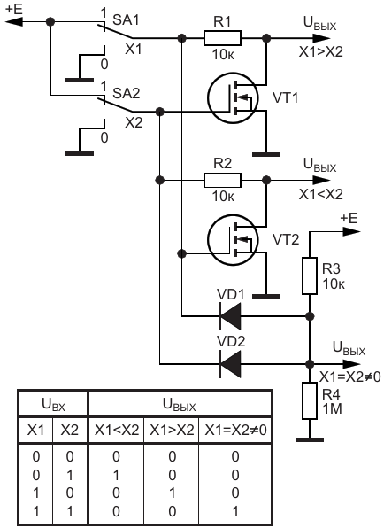 Рисунок 1. Электрическая схема эквивалента логического элемента «Запрет» и его таблица истинности