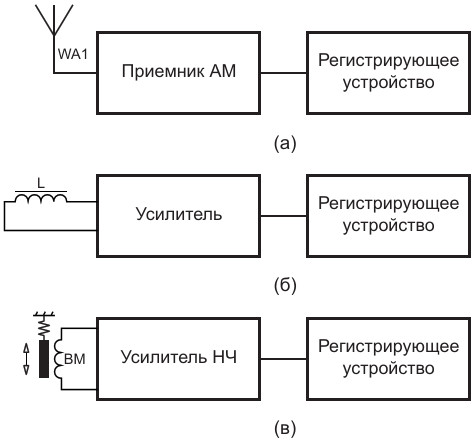 Рисунок 1. Простейшие и ныне устаревшие приборы для измерения: а) электрической; б) магнитной и в) акустической составляющих излучений недр Земли