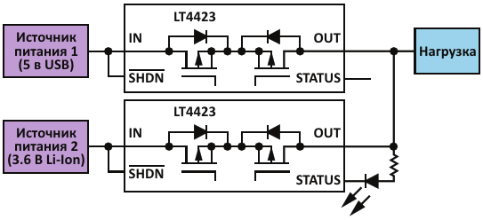 Рисунок 2. Два идеальных диода обеспечивают более высокий КПД и дополнительные функции