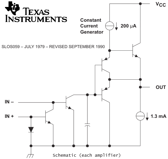Эквивалентная схема демонстрирует минималистскую внутреннюю структуру микросхемы усилителя Нортона LM2900