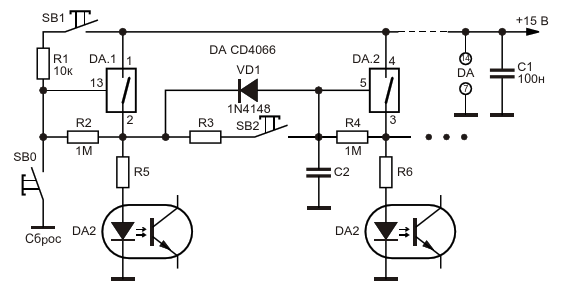 Рисунок 3. Схема зависимо-последовательного включения нагрузок с использованием КМОП-коммутаторов CD4066