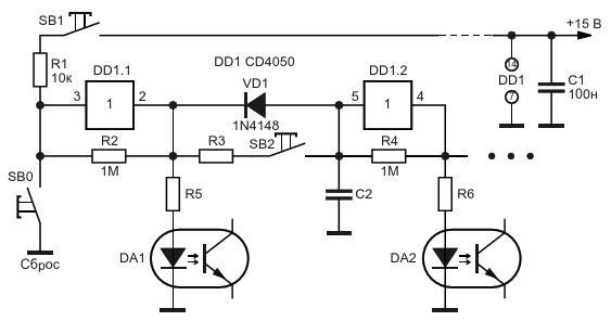 Рисунок 5. Схема зависимо-последовательного эстафетного включения и отключения нагрузок с использованием КМОП-инверторов CD40106