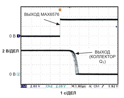 Рисунок 2. Относительный джиттер, измеренный от положительного фронта выходного импульса IC2 до выхода схемы (коллектор Q1), составляет в среднем менее 1 мкс