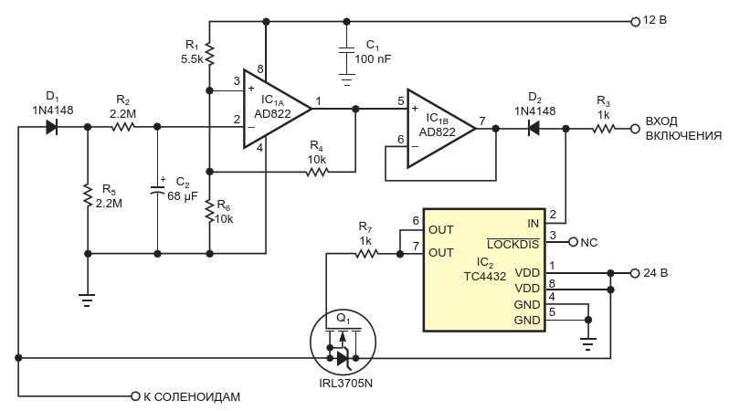 В запускаемом внешним сигналом драйвере соленоидов используется аналоговый ограничитель времени включения