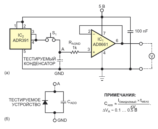 С помощью этого простого устройства сначала подают опорное напряжение на тестируемый конденсатор, а затем измеряют спад напряжения во времени на выходе повторителя напряжения (а) Схема также может измерять ток утечки обратносмещенного активного устройства