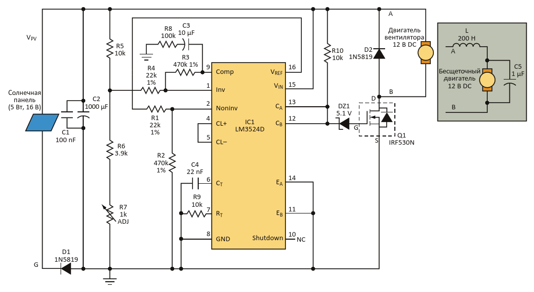 Ядром схемы, реализующей слежение за точкой максимальной мощности, служит микросхема широтно-импульсного модулятора, регулирующая не выходное, а входное напряжение