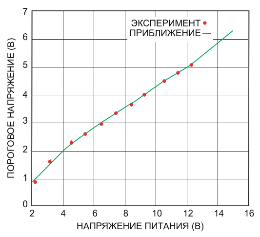 Рисунок 2. Пороговое напряжение логического элемента почти линейно зависит от напряжения источника питания