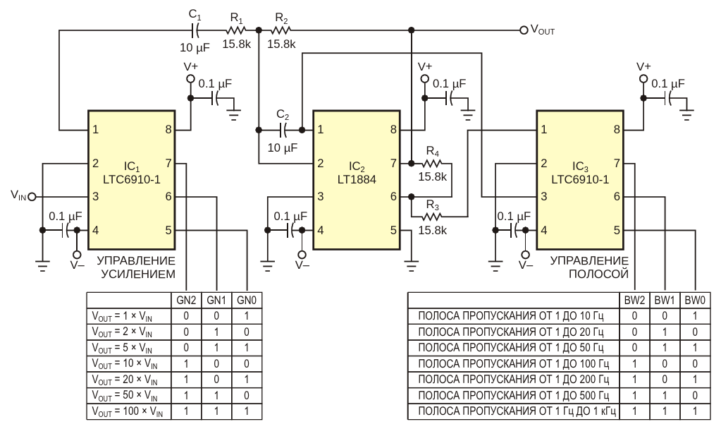 Малошумящий усилитель переменного тока с цифровым управлением усилением и полосой пропускания