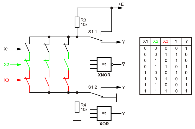 Эквивалентная схема выходной части логического элемента «3Исключающее ИЛИ»/ «3Исключающее ИЛИ-НЕ» (3XOR/3XNOR) и его таблица истинности