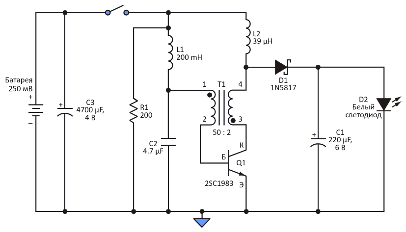 Рисунок 1. В схеме этого преобразователя используется третий провод, подключенный перед выключателем питания для первоначального «толчка», запускающего преобразователь при напряжении менее 250 мВ. В схеме применен кремниевый биполярный транзистор, а не германиевый и