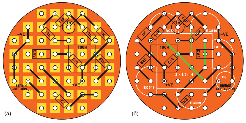 Компоненты схемы могут быть собраны на двух сторонах круглой макетной печатной платы. Соединения на нижней стороне изображены зеркально (а); размещение компонентов на верхней стороне показано белым цветом, а соединения - зеленым (б)