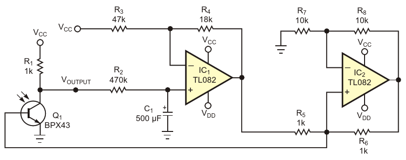 Цепь обратной связи, состоящая из однополюсного активного фильтра нижних частот и источника тока Хауленда, отбирает ток из базы фототранзистора, не допуская насыщения при чрезмерных уровнях фоновой засветки
