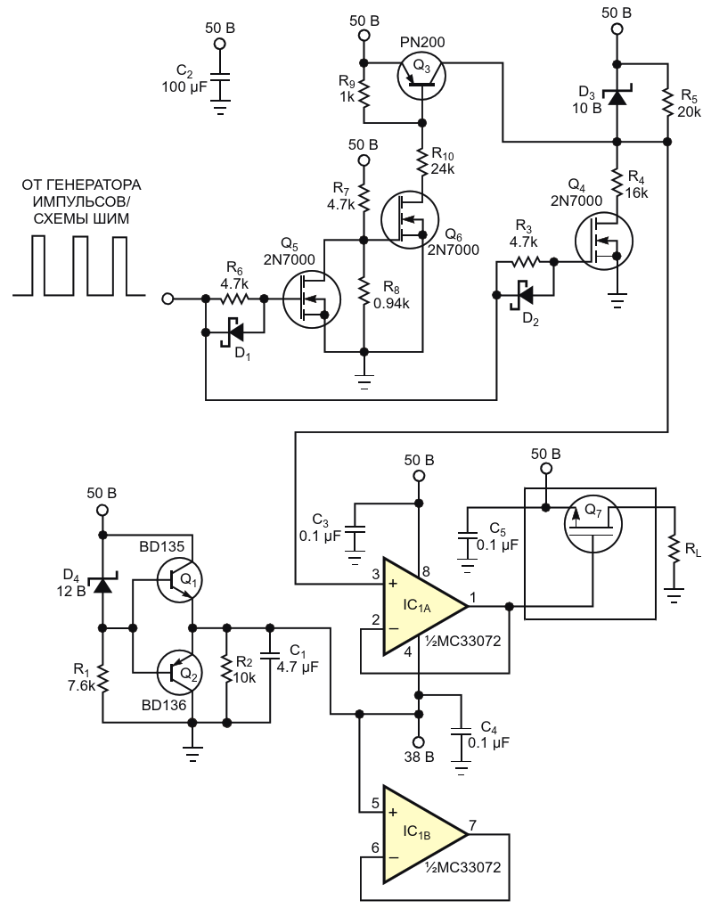 Операционный усилитель, включенный между шинами 38 В и 50 В, подает питание в нагрузку через мощный MOSFET Q