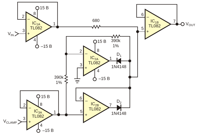 Рисунок 1. Эта схема обеспечивает ограничение входного сигнала в диапазоне, регулируемом от ±1 В до ±10 В