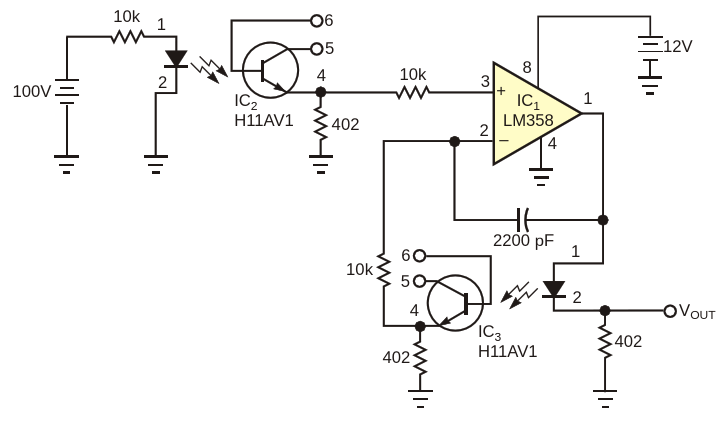 Используя два оптоизолятора вместо одного, можно компенсировать температурный дрейф усиления