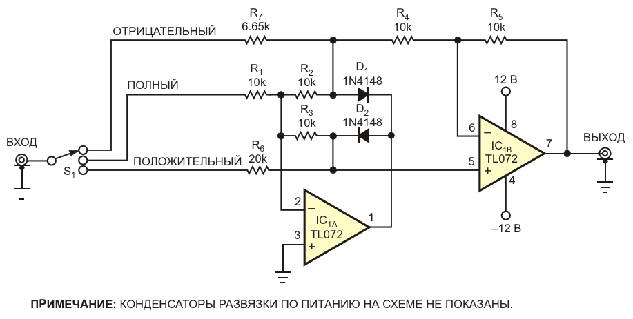 Эту универсальную схему прецизионного выпрямителя можно использовать для восстановления положительных пиков, отрицательных пиков или обоих в двухполупериодном режиме