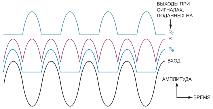 На этом графике показаны выходные сигналы схемы при синусоидальных напряжениях, подаваемых на входы ОТРИЦАТЕЛЬНЫЙ, ПОЛНЫЙ и ПОЛОЖИТЕЛЬНЫЙ, соответственно. Для удобства восприятия кривые смещены по вертикали