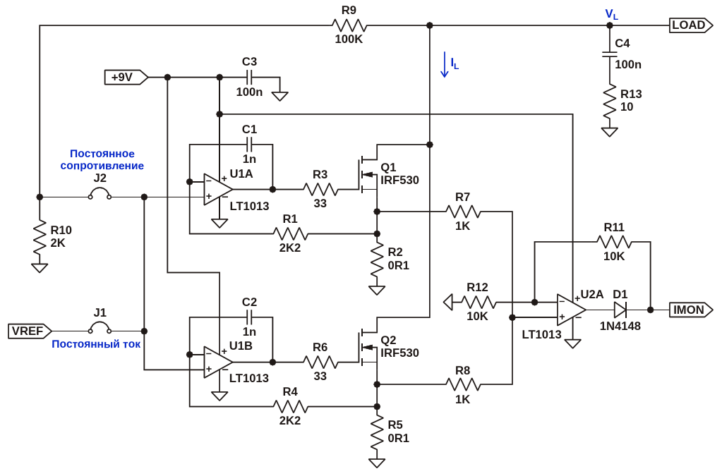 В этой схеме электронной нагрузки используются два независимо управляемых MOSFET