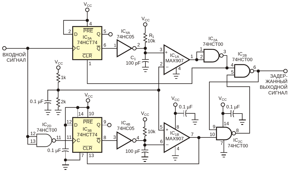 Эта линия задержки, основанная на прецизионном сдвоенном компараторе, формирует импульсы точной длительности