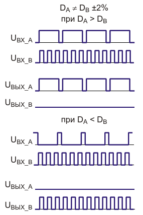 Динамика электрических процессов на входах и выходах селектора при различном соотношении коэффициентов заполнения входных сигналов