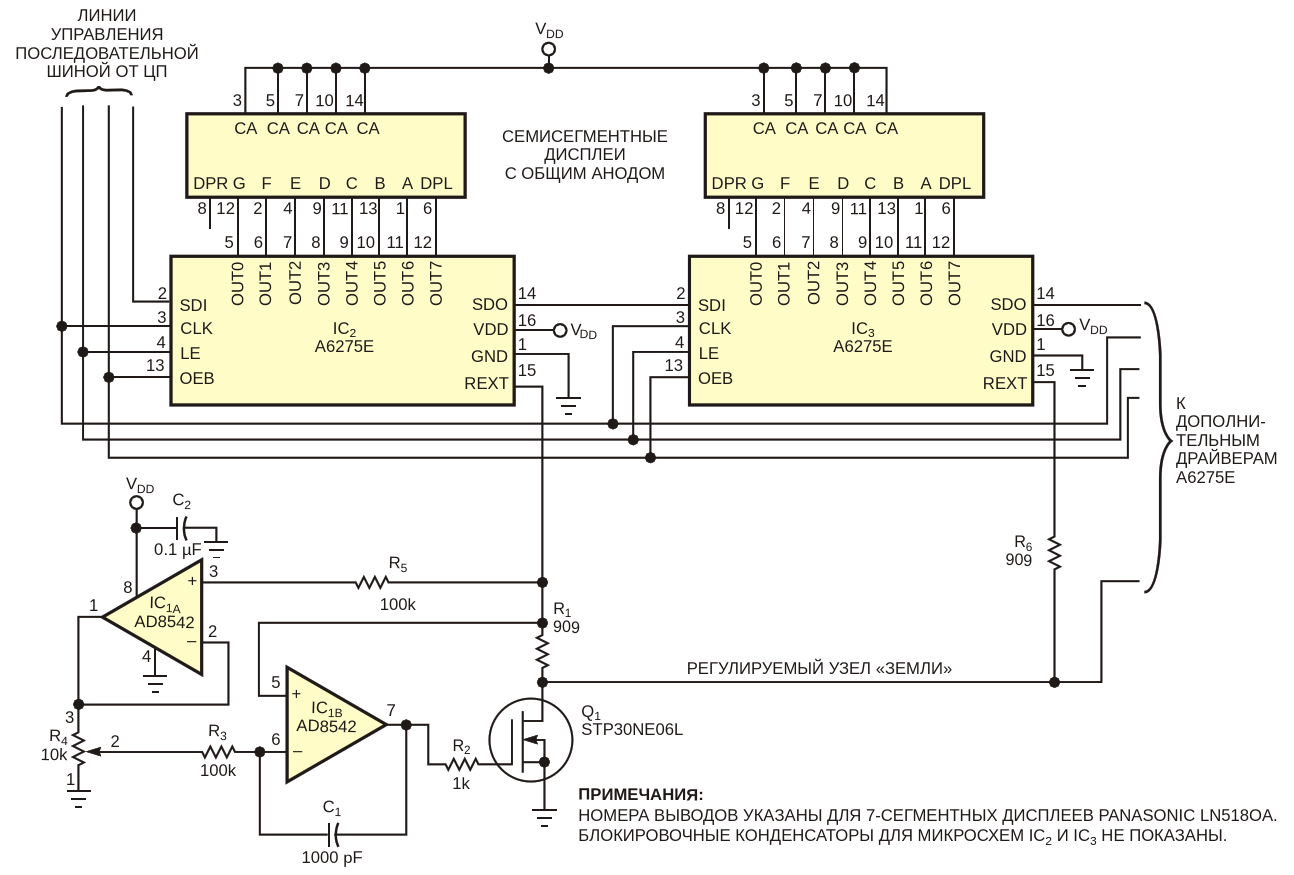 Аналоговый контур управления обеспечивает регулируемый «земляной» узел для управления током, протекающим через резисторы, задающие токи сегментов