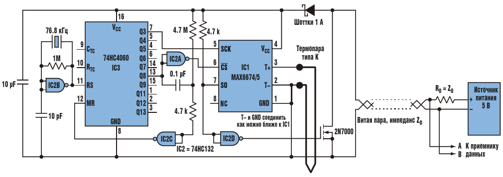 Эта схема, питающаяся от источника напряжения, находящегося на дальнем конце 900- метрового кабеля, оцифровывая выходной сигнал термопары возле точки измерения, минимизирует влияние электромагнитных помех
