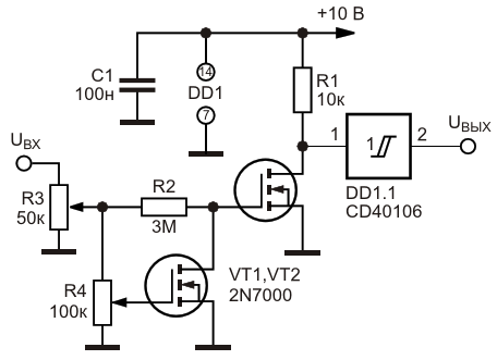 Рисунок 1. Электрическая схема оконного амплитудного фильтра (оконного клапана) с использованием на выходе элемента «НЕ»