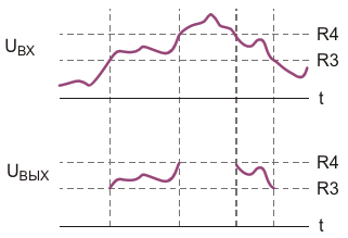 Форма электрических сигналов на входе и выходе оконного фильтра (Рисунок 4) для выделения полосы амплитуд сигналов, проходящих через него