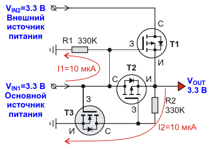 Схема диодного «ИЛИ» для объединения низковольтных источников питания