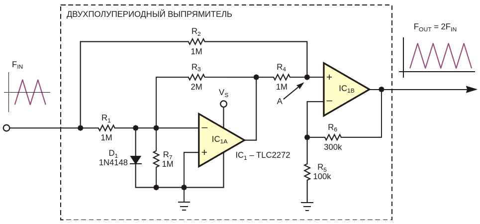 Эта схема выполняет умножение частоты последовательности треугольных импульсов