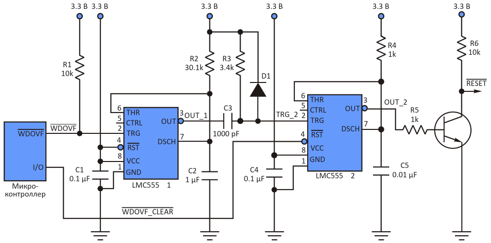 Рисунок 1. Первый таймер LMC555 запускается сигналом переполнения сторожевого таймера микроконтроллера и обеспечивает задержку сброса. Второй LMC555 позволяет микропрограмме запретить готовящийся аппаратный сброс