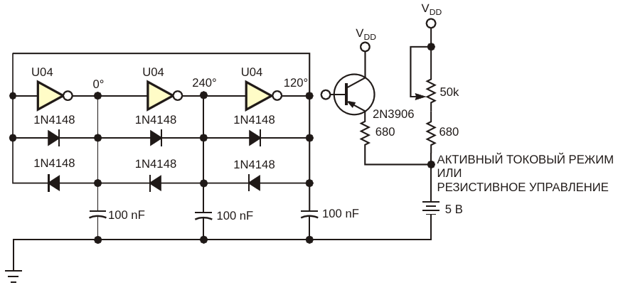 Рисунок 1. Кольцевой генератор с трехфазным выходом, работающий в широком диапазоне частот