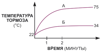 При непрерывной работе под напряжением 24 В температура тормоза стабилизируется на уровне 75 °C, что на 53 °C выше температуры окружающей среды (кривая А). Подача на несколько секунд импульса активации 24 В с последующим переходом на напряжение уд