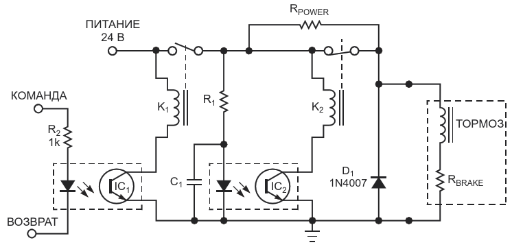, подавая на тормоз напряжение 24 В. RC-цепочка задерживает срабатывание реле K