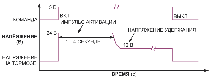 После подачи на тормоз импульса активации полной амплитуды выходное напряжение регулятора постепенно уменьшается до номинального напряжения удержания