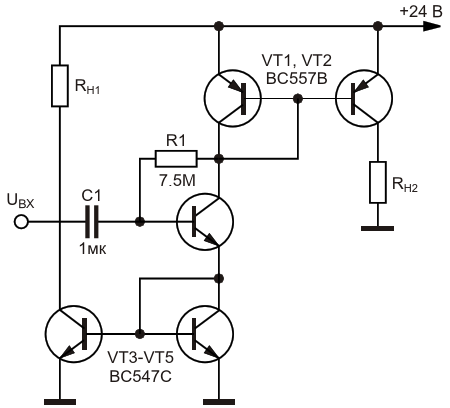 Рисунок 4. Усилитель низкой частоты на основе прецизионного токового зеркала