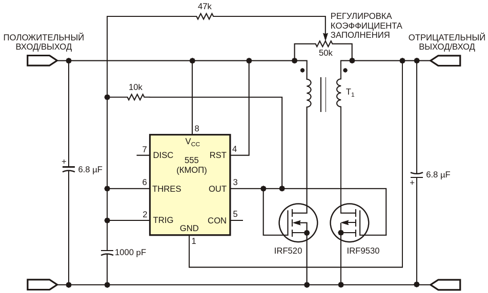 Схема инвертора обеспечивает обмен зарядами между батареями с противоположной полярностью подключения