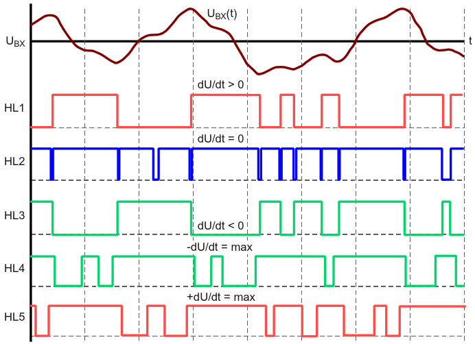 Рисунок 2. Уровни сигналов на входе и выходах градиентного анализатора аналоговых сигналов