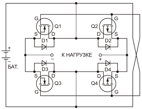 Эта схема обеспечивает питание нагрузки при любой полярности установки батареи