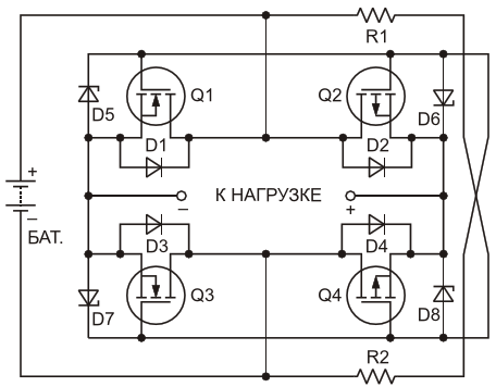 Рисунок 3. Эта схема обеспечивает питание нагрузки при любой полярности установки батареи