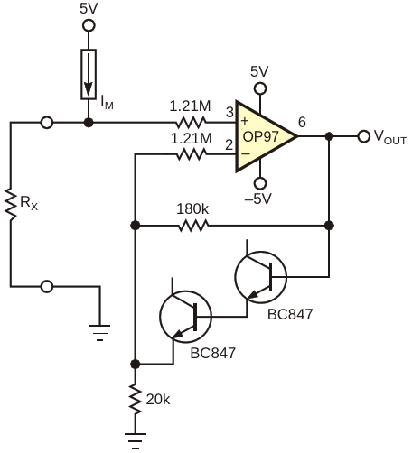 Добавление двух диодов в цепь обратной связи предотвращает прохождение чрезмерных входных токов в усилитель OP97