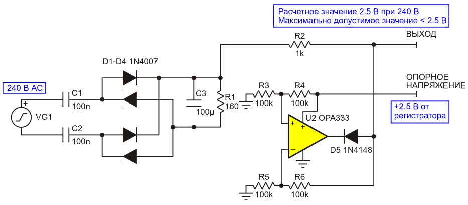 Схема ограничителя, показанная со схемой измерения переменного напряжения