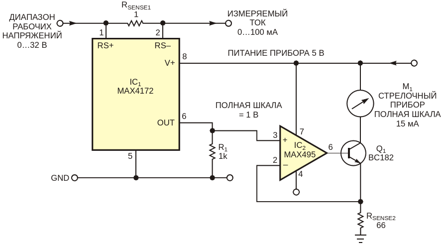 Эта схема позволяет использовать стрелочный прибор в приложениях, в которых ток измерителя составляет значительную часть измеряемого тока