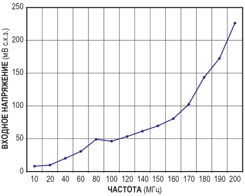 Рисунок 3. График зависимости уровня входного сигнала от рабочей частоты высокочастотного компаратора, измеренный относительно опорного уровня источника высокочастотного сигнала до чистого логического выхода, показывает чувствительность лучше 100 мВ на частоте 160 М
