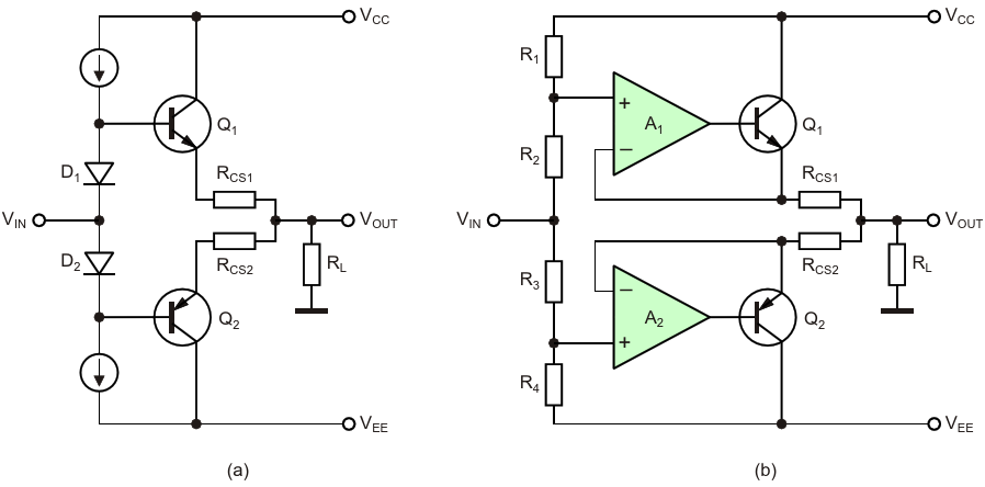 Топологии усилителя мощности с диодным смещением (а) и смещением, поддерживаемым операционными усилителями (б)