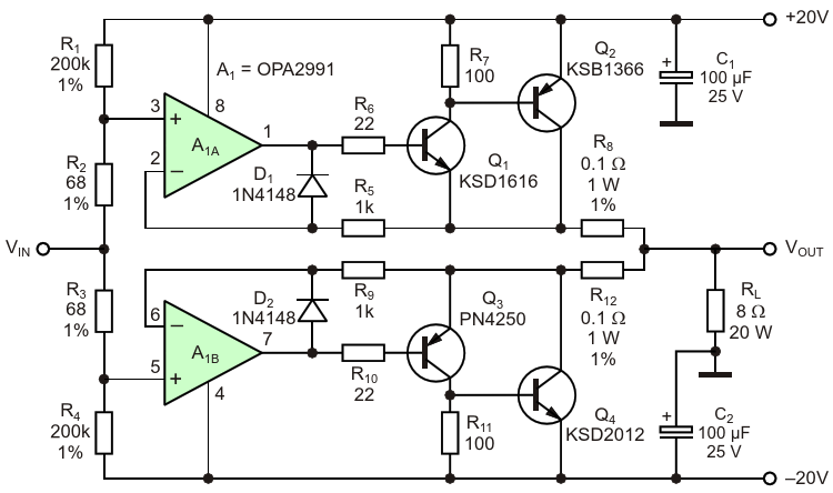 Эта схема с увеличенным выходным током обеспечивает мощность до 20 Вт и демонстрирует четко определенный, не зависящий от температуры ток покоя