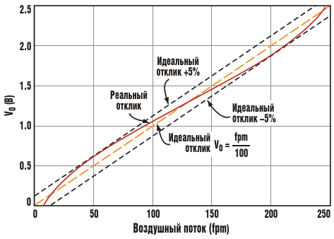 Рисунок 2. Квадратичная зависимость между IQ и относительной мощностью, рассеиваемой транзисторами Q1/Q2, неплохо устраняет все ошибки линейности во всем диапазоне скоростей, кроме ±5% погрешности полной шкалы
